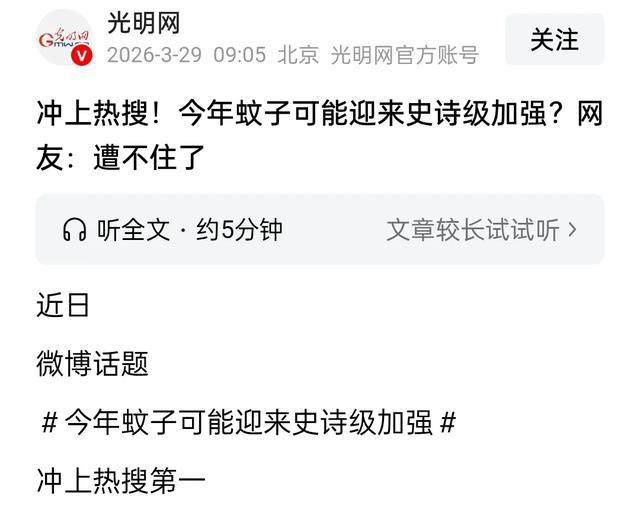 之所以有这样一个热搜话题,是因为我国很多地方的网友发现虽然才春分节气刚过不久,但是很多蚊子已经开始出来嚣张了,特别是南方地区,有网友称被蚊子叮到彻夜难眠,而尚未脱下厚外套的北方,室内竟已出现蚊群盘旋。