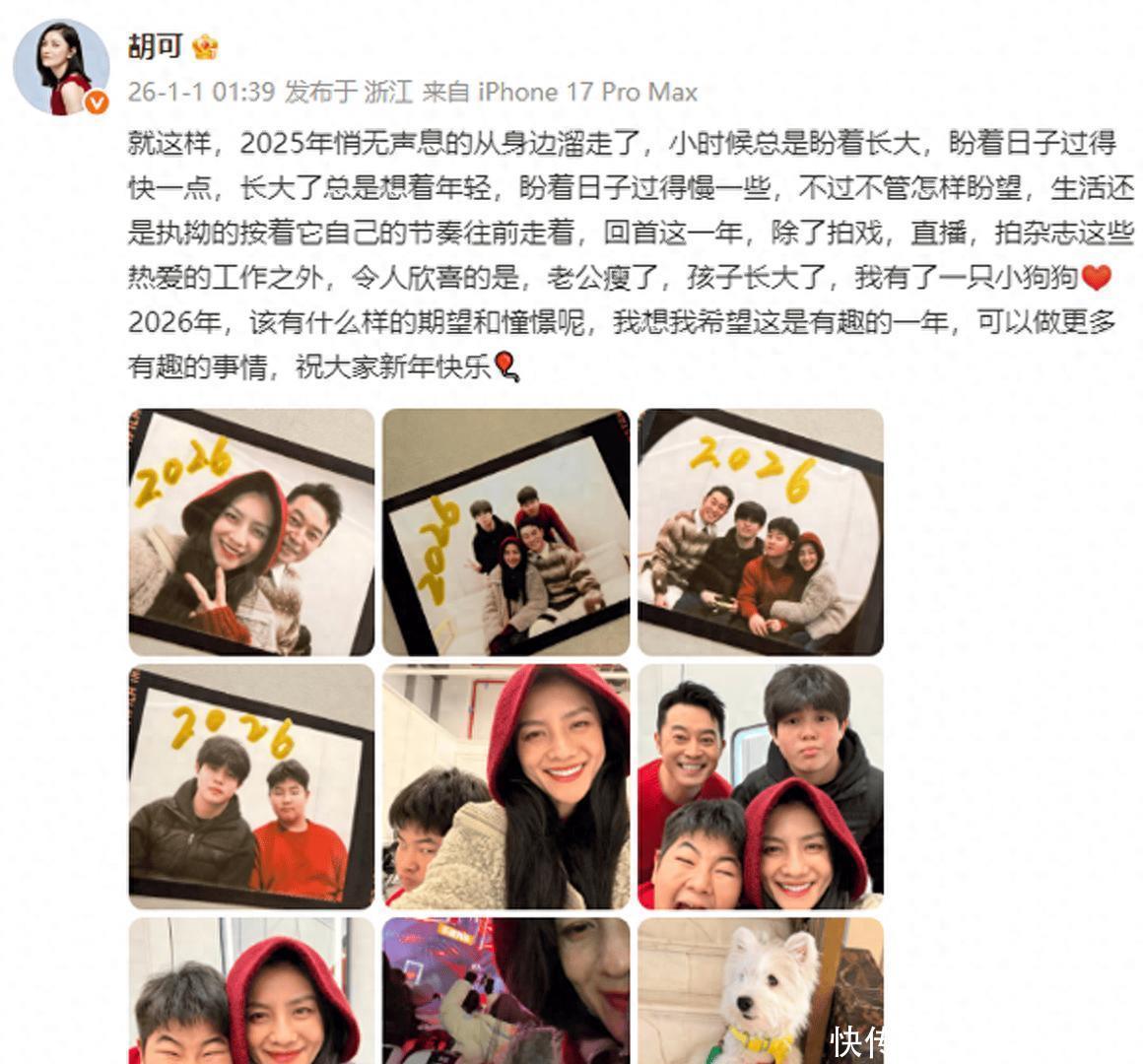 现在明星晒照,动不动就是豪华派对、精致礼服。可胡可这条动态,飘出来的却是饭菜香和洗衣粉味道。她提到老公瘦了、孩子长了、多了只狗,全是家里那点烟火气。